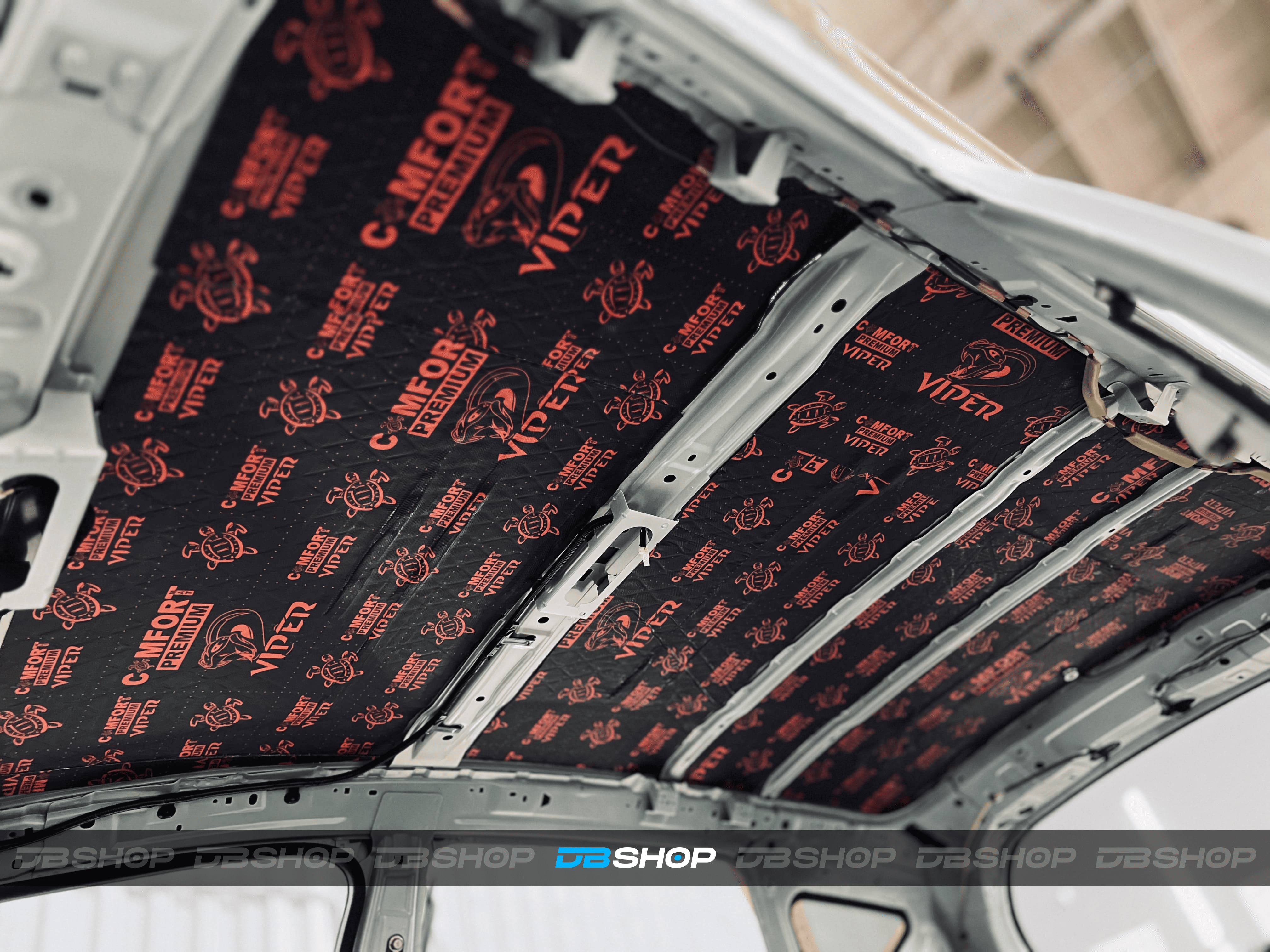 Первым слоем на крышу нанесли виброизоляцию Comfort Mat Viper. Ультралегкий инновационный виброизоляционный материал премиального уровня толщиной 3 мм с мастичным слоем и расширенным КМП.