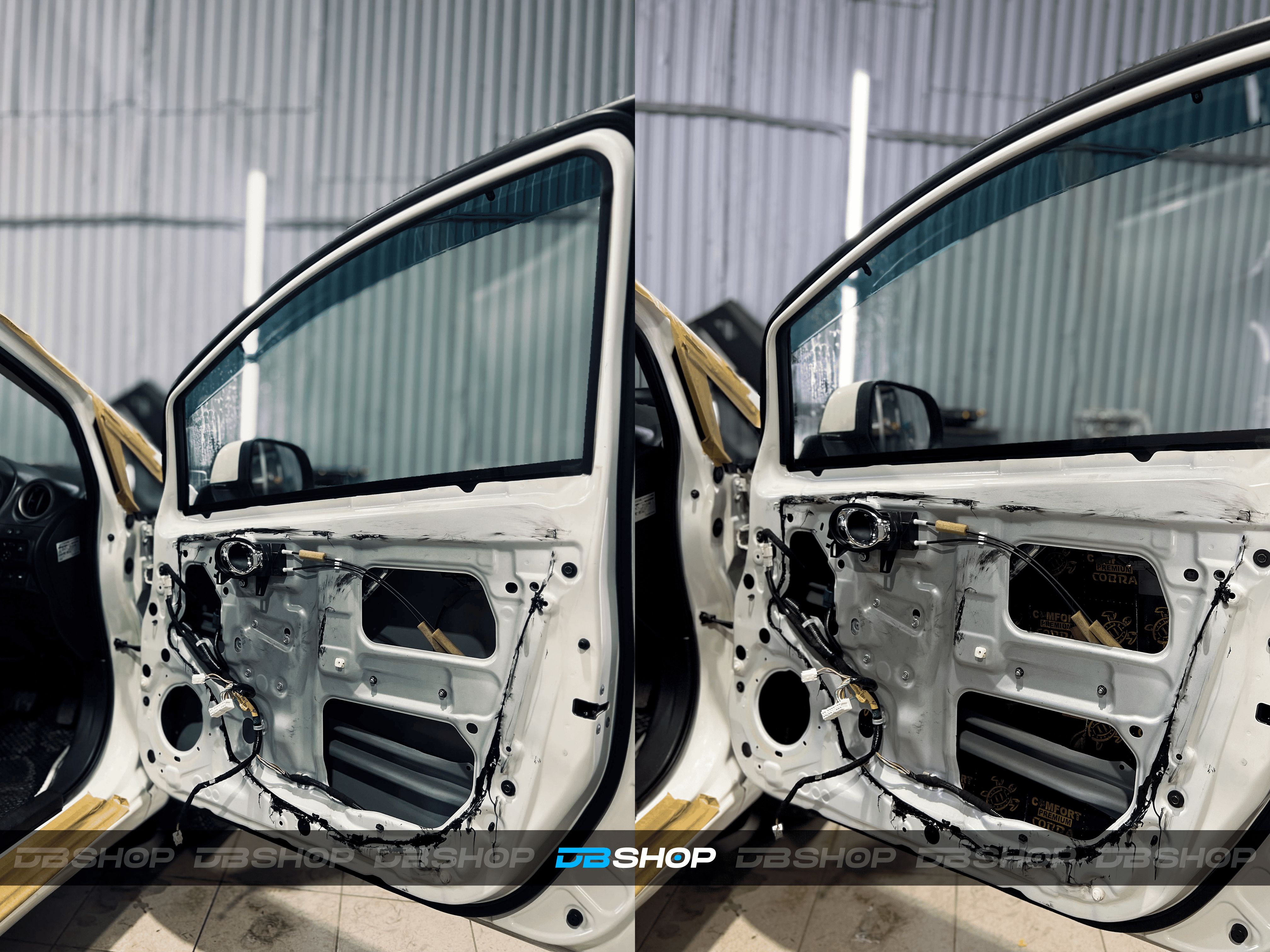 Работа началась с демонтажа дверных карт. Первым слоем на двери и дверь багажника нанесли виброизоляцию Comfort Mat Premium Dark Cobra.