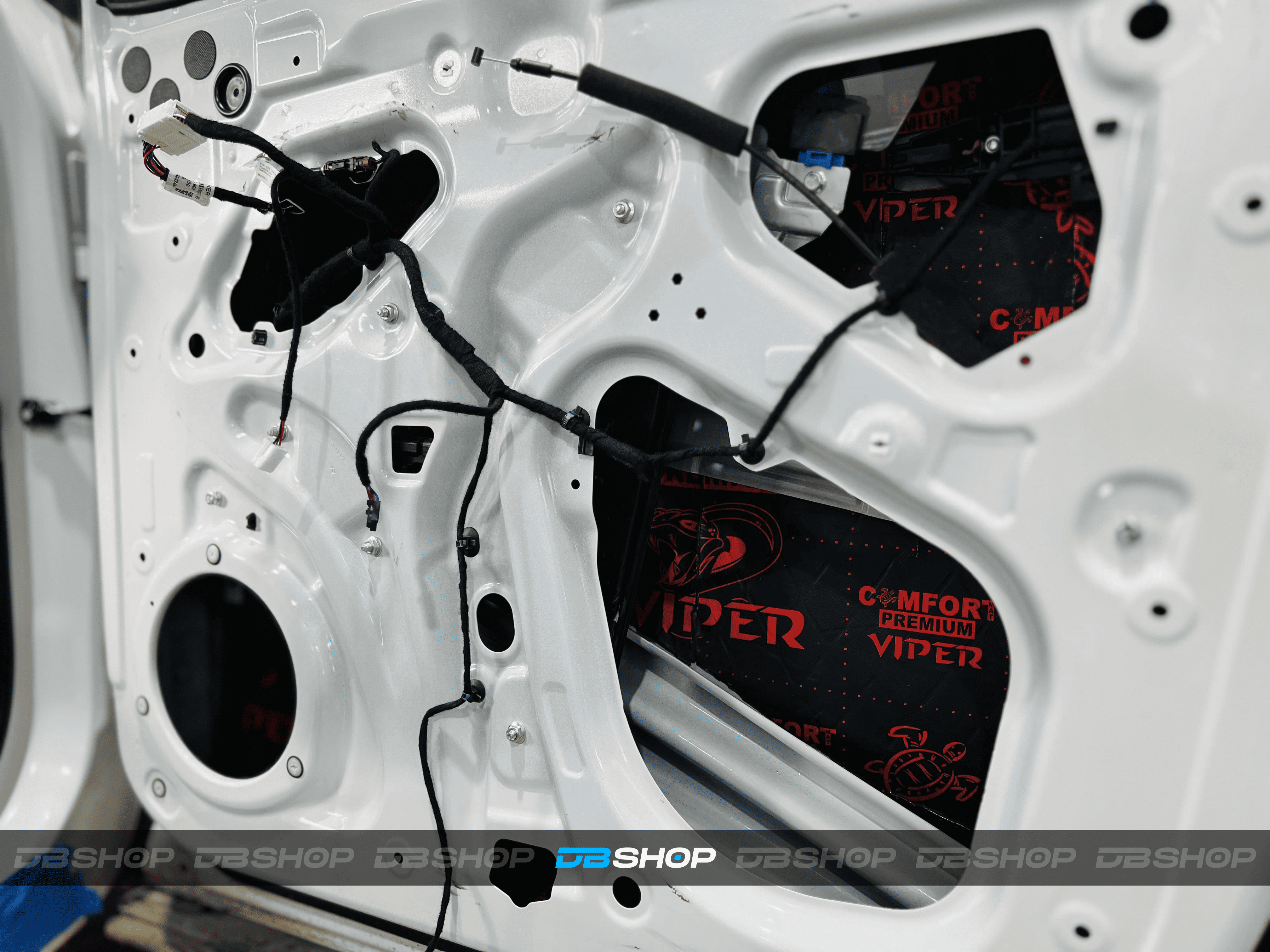 Первым слоем на двери нанесли виброизоляцию Comfort Mat Viper. На снимке видна дверь, покрытая слоем Viper, с аккуратным нанесением.