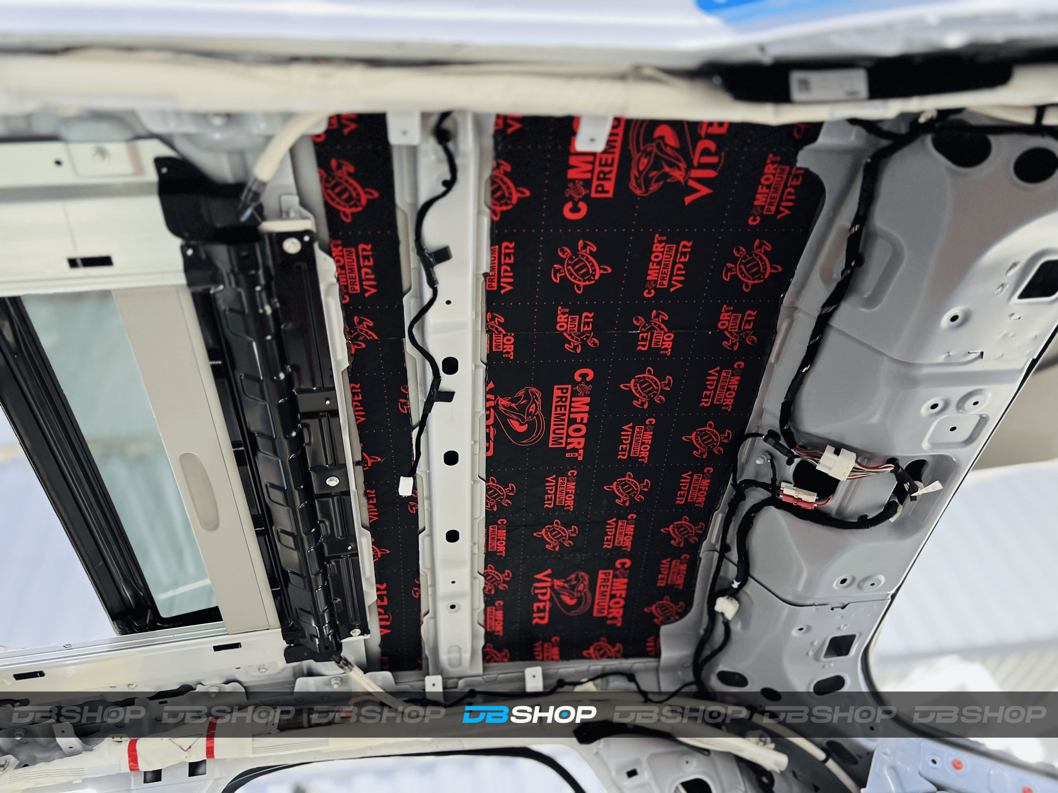 Работа началась с демонтажа потолочной обшивки, обнажив металлическую поверхность. Первым слоем на крышу нанесли виброизоляцию Comfort Mat Viper.